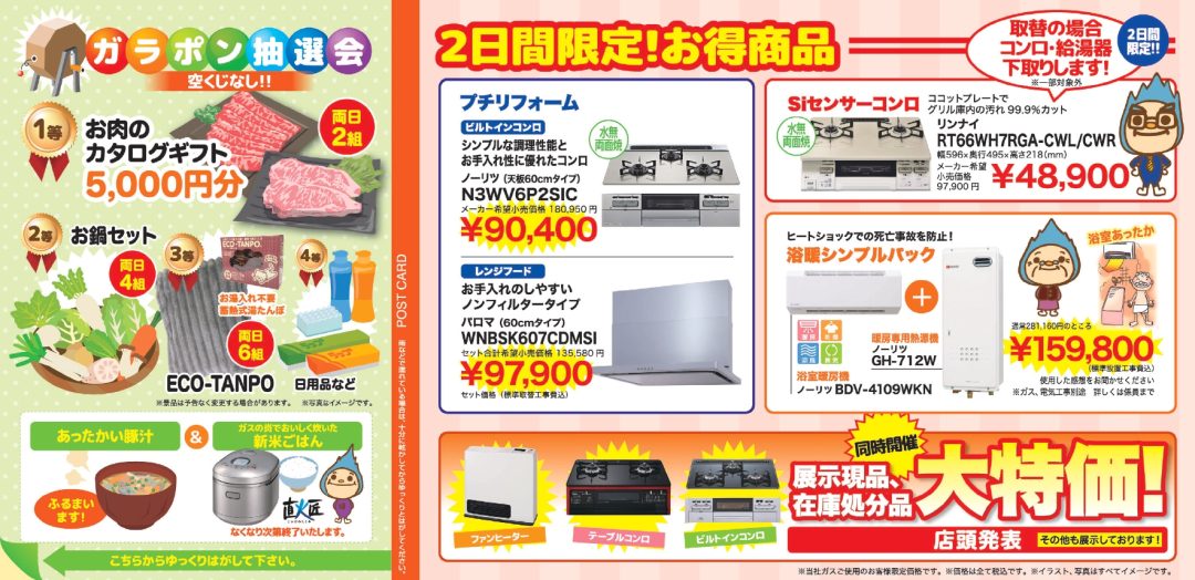2日間限定でガラポン抽選やガスの炎で炊いた新米ごはん、豚汁もふるまいますので、ぜひお立ち寄りください。